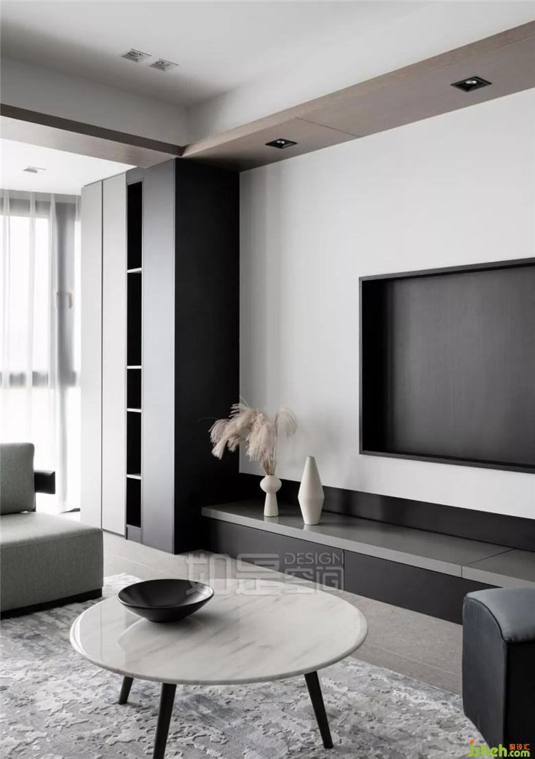 电视墙左边的柜体位置,原来是客厅到阳台之间的承重墙。现在室内设计师已巧妙隐藏掉了,已不可能再看出这里有一截突兀的短墙,因为设计师已将承重墙包入装饰柜内,融为一体。