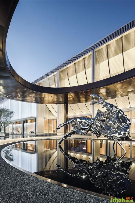 随着参观动线层层递进,津门故里的故事内核慢慢展开。高墙大院营造出曲径通幽的园林意境,水滴雕塑形似天津海河入海定格凝聚的一瞬间。大面积的水域托衬出建筑的光泽,将边界模糊至海天相接处那看似分明却触碰不到的视觉消失点上。