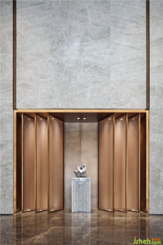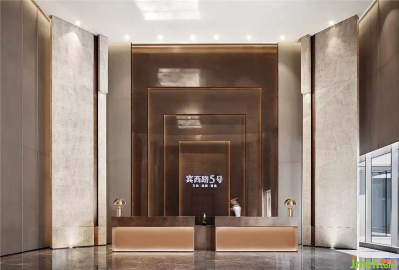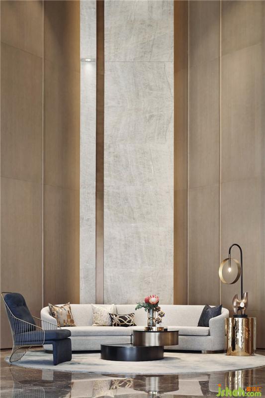 顶部及立面四周的通高石材形成环绕感,让人站在空间的每个角落都能感受到津门的存在。而接待处则通过精心布局石材的层次将视线引向纵深,两侧通顶的大门如张开的双臂,提升了空间的整体调性以及美好寓意。
