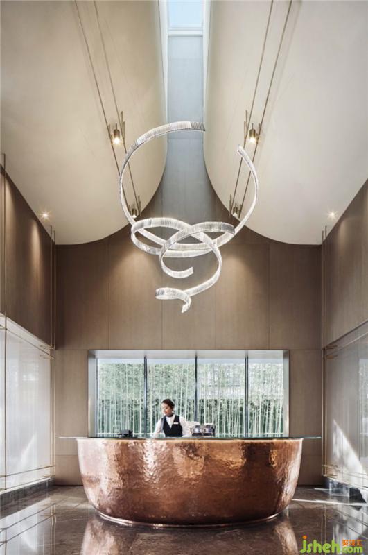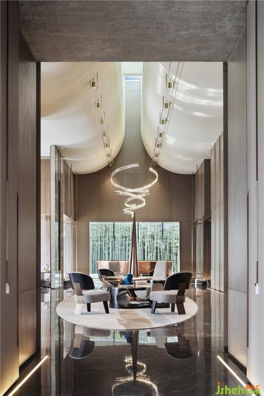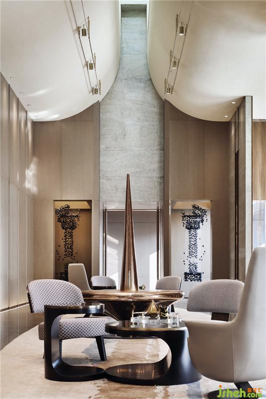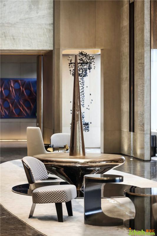 金属饰面的陀螺装置,定格在旋转的状态却又静止恬然,如宾江路五号在时代的川流不息中独具坦然与自在。室内设计师