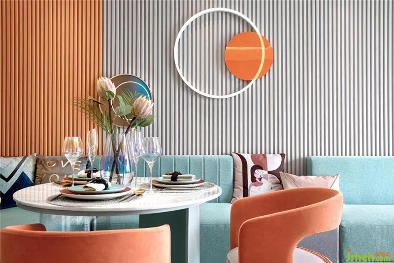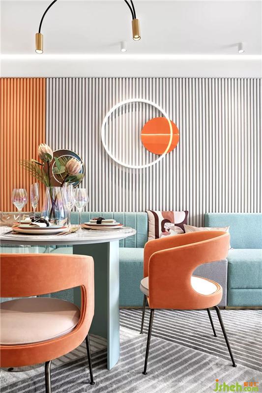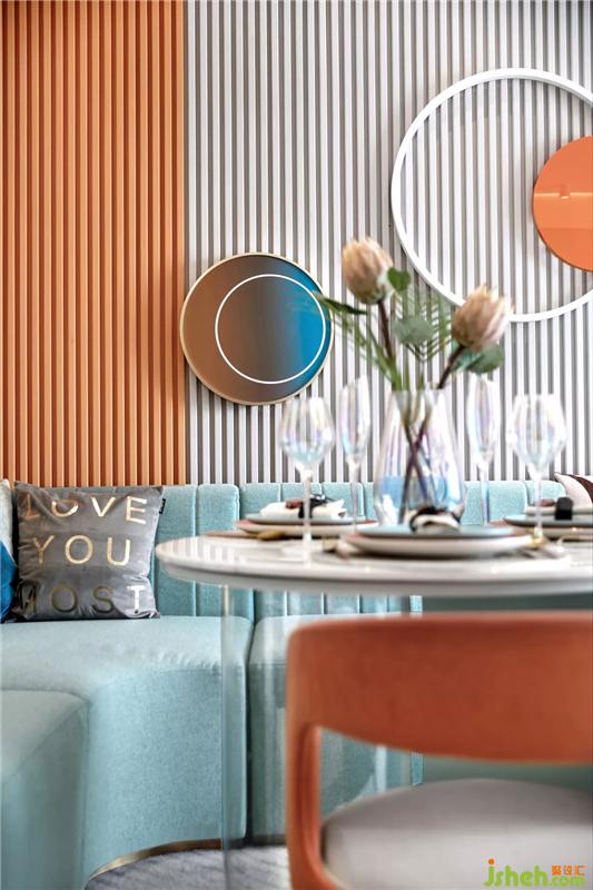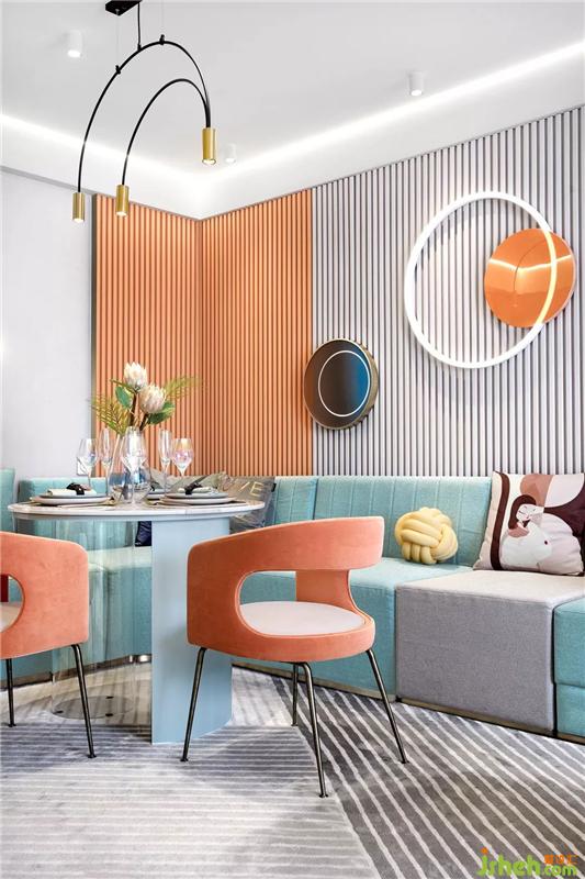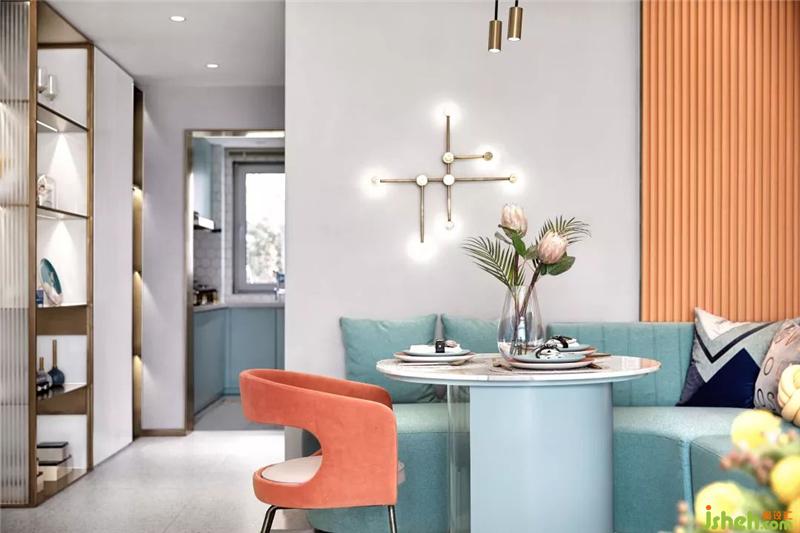 客餐区主色调为橙色和蓝色,清新的色彩抓人眼球,加上星星点点的灯,简约精致的桌椅,每一处都展现了餐厅特有的轻奢氛围。马卡龙色,静谧自然、轻松惬意,通过色调和色温的表达,层层递进中,颜色的传递与物象的表达,让你拥有一刻安宁与静谧的时光。样板房设计
