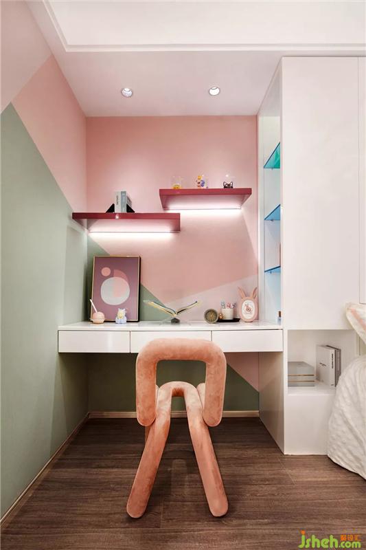 儿童房选用桃粉色为主色调搭配薄荷绿,墙面的色块拼接是一种兼容的色彩手法,能够把你喜欢的颜色统统“上墙”,以几何图案的形式呈现。居室中细腻浪漫的情怀扑面而来,纯净的少女粉还可传递出,可爱甜美温馨感。