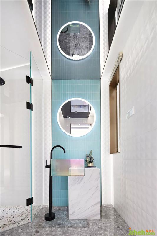 白色与水蓝色交错的轻奢范儿空间中,搭配黑色金属,将整个空间烘托的干净清爽,打破常规的洗手盆将炫彩玻璃与大理石穿插相结合时尚又有趣味,用最直白简洁的方式让你拥有一刻安宁与静谧的时光。