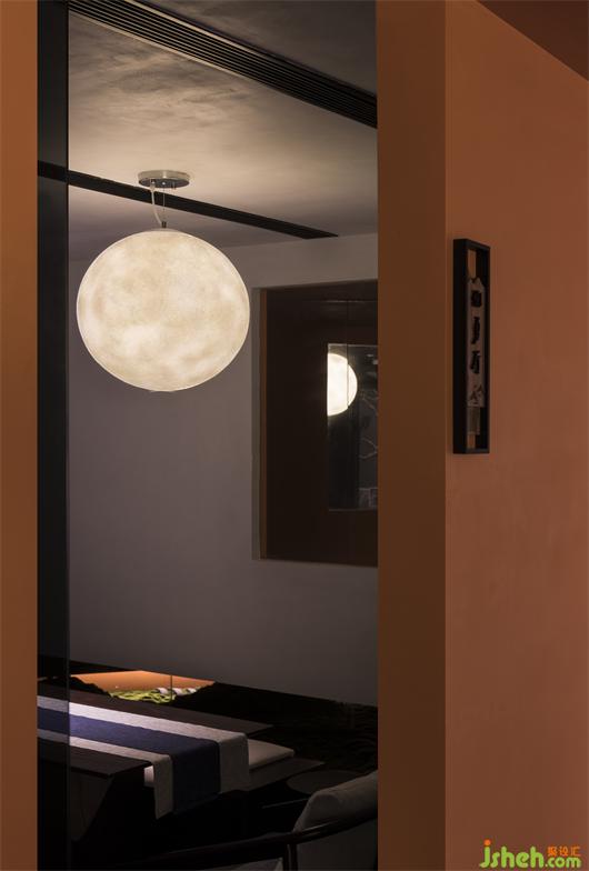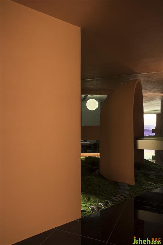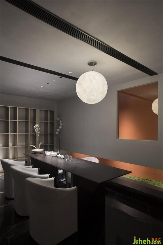 延续了流动形态的线条语素,同时以取自甲板的暖木色调、木艺材料装点,从一种全新的角度诠释感官沉浸的。空间布设月球元素吊灯,将人的视线还给自然意向,模糊内外与自然的界限。