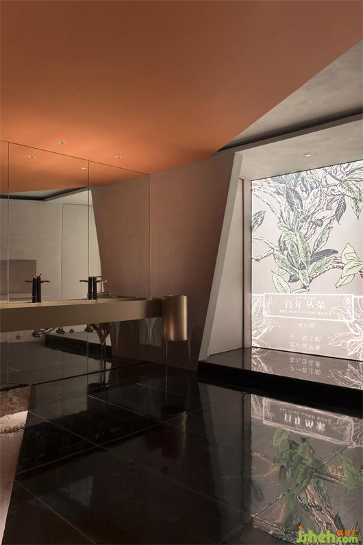 以游艇船舱中的温润木质和华丽灯膜表现出悠闲的度假氛围,玻璃镜面折射出极具张力的光影变化,洗手区域设计通过顶部和墙面花卉幕布的结合,构建出目之所及,皆为景色。