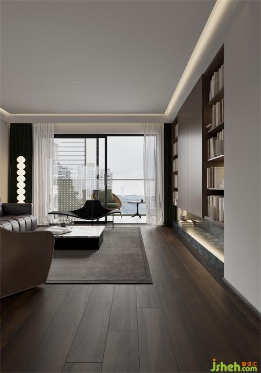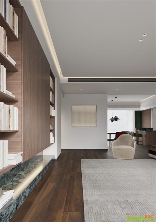 客厅电视柜设计成点电动推门,要看电视时只需要轻轻一按遥控,推门就会从两边自动打开,平时在家,三米家居设计把电视藏起来,秒变家庭“图书馆”。