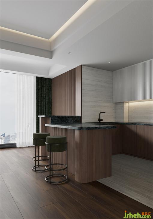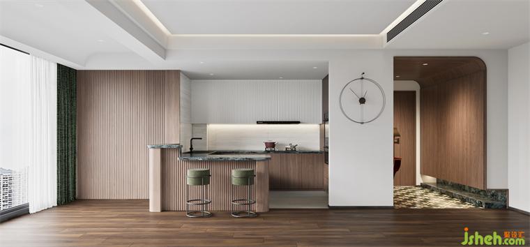 左边储物间门做了隐形门处理,三米家居设计开放式厨房让T姐做饭时也可以与家人互动。