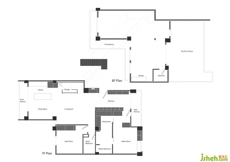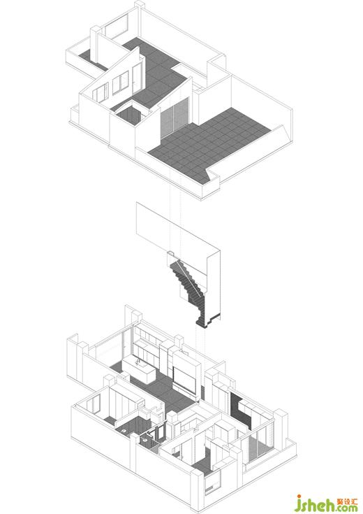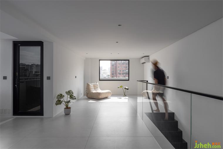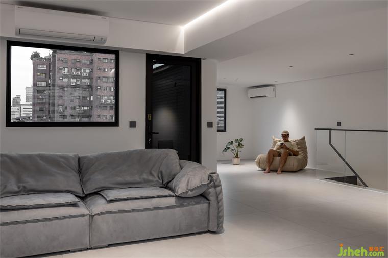 复式装修设计得利于八楼充足的日光条件,在观察阳光照射⻆度及空气对流状态后,于北面露台窗洞,划设折叠气密门,连接室内外空间,亦有效放大视野。南面长廊则规划为办公及瑜伽空间,当需要深夜工作或进行瑜伽冥想时,得以僻一隅静谧,与七楼的生活机能区隔开来。