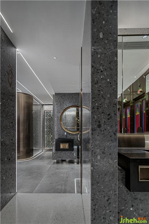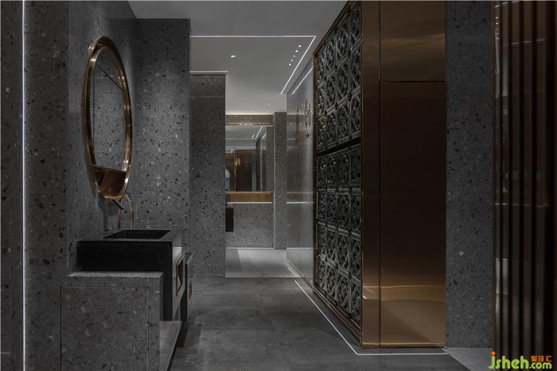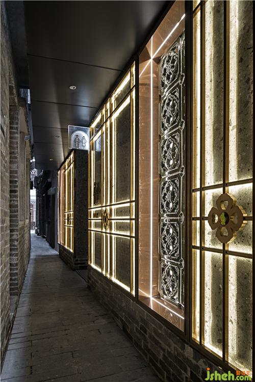 灰色水磨石作为主色调与古城对应,相辅相成,拱形门上标识巧妙的融入了粤语的元素使其更加具有当地特色,也从侧面展示着这是在古城的文化形态上生长出来的空间。