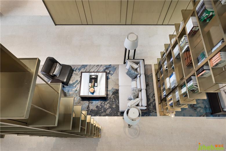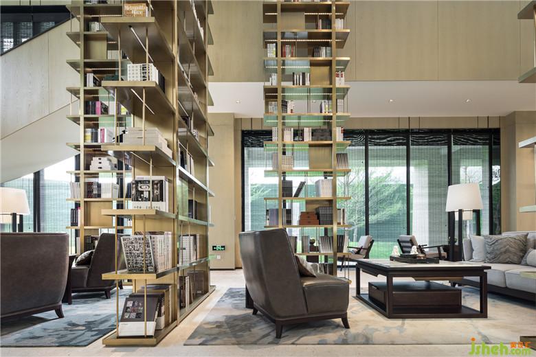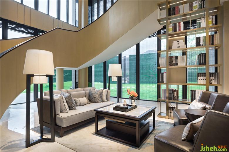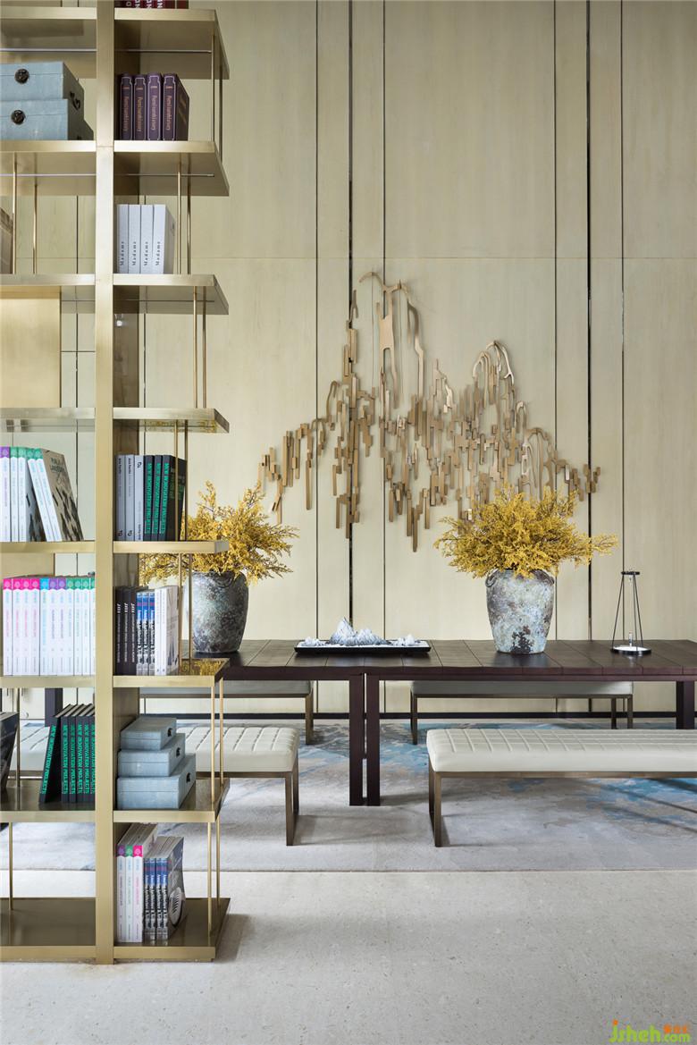 现代风格的沙发茶几演绎着当代休闲空间里的悠然慵懒之感,巧妙的是,室内设计师利用落地窗上低调的竹挂帘,以及用现代雕刻手法演绎的金属山水挂画,暗示着这个看似现代摩登的空间,与整体大空间所渲染的“东方意境”一脉相承。而这样的蒙太奇设计手法,又何尝不是“山近月远觉月小,便道此山大于月”的巧妙体现!