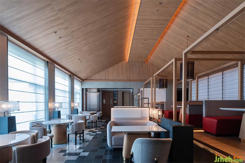 悬山顶的屋顶被简化,只保留了正脊和垂脊的线条碰撞在一起,呈现出几何本质的美。会馆设计夜间以光作导引,简约亦不失风骨。不同的垂脊给室内增添了不一样的韵味,或旷达抒意,或典雅温润。设计师用大面积色块在空间进行分割,使得其简约但不简陋,大气规整。