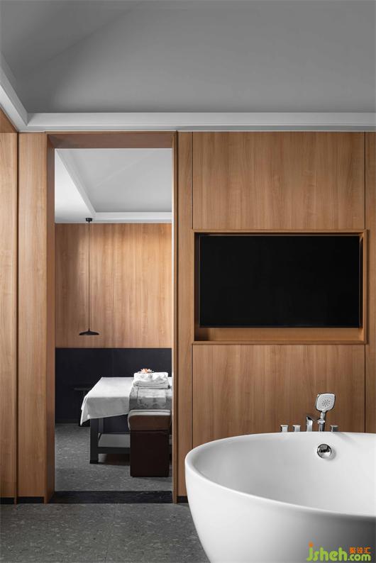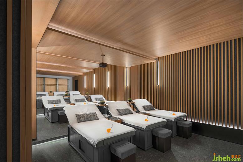 除此之外,养生馆内还配有9人间的足浴影音室,室内分为三阶,侧立面饰以大面积木栅栏,整体感觉像一个小型电影院。