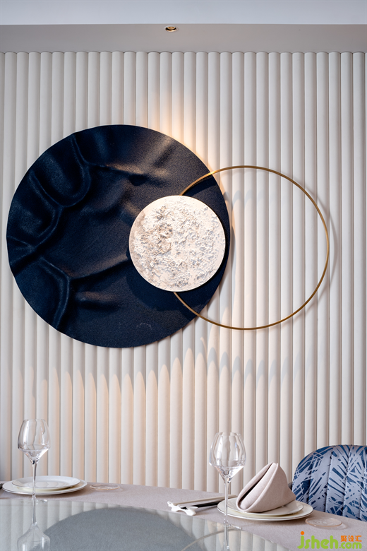 “青山隐隐水迢迢,秋尽江南草未凋。二十四桥明月夜,玉人何处教吹箫?”「银月」的名字来源于杜牧的「寄扬州韩绰判官」。取自瓷器的靛蓝色点缀空间,背景墙的装饰将满月与弦月融合表达,抽象的美将空间的戏剧化淋漓尽致的表达,人文的情感与表达语言相互融合,将人置身于“情景”之中,感受温润雅致的新派意境。