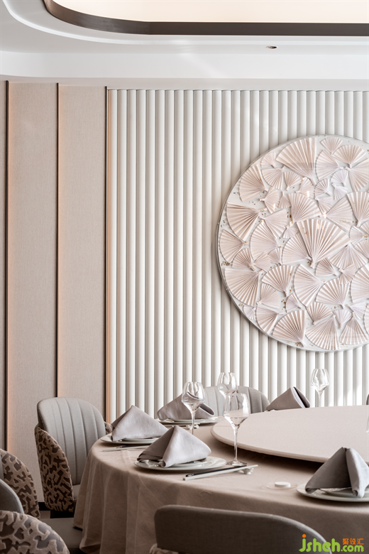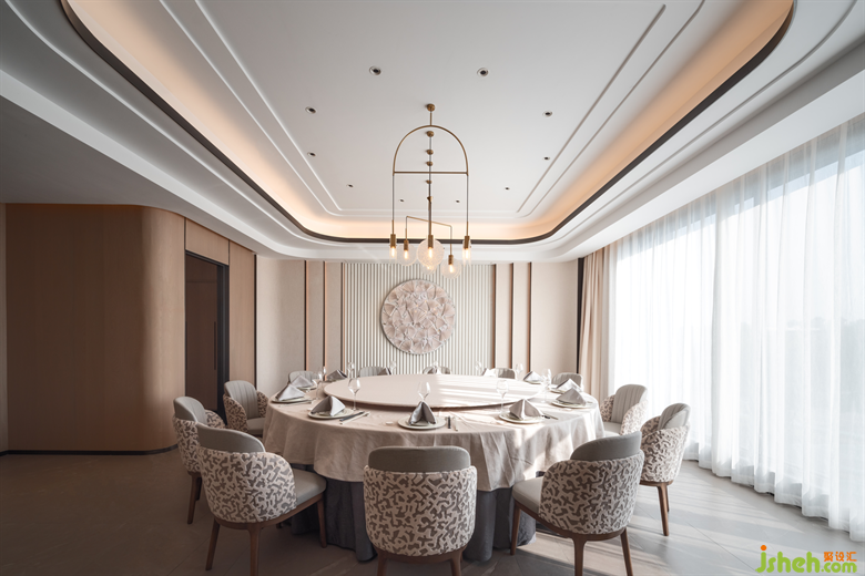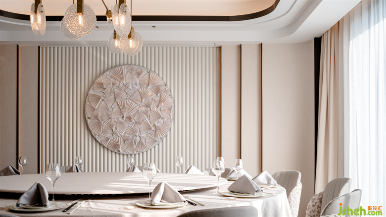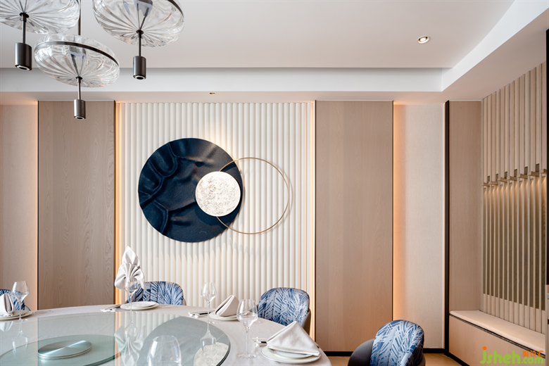 背景墙上干净清透的石材色营造出自然意境,与木制的搭配间有着最契合的交点,空间内的陈设之物在光影藏纳间、在虚实互映中,交织出自然的诗意与东方的风雅。餐厅在端正的序列格局与简净的美学风貌中,构建起就餐礼仪与氛围。