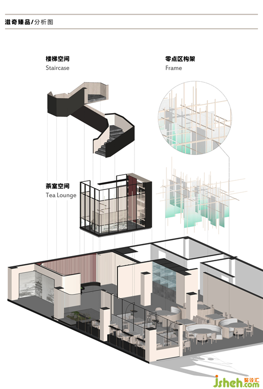 “娉娉袅袅十三余,豆蔻梢头二月初。”「豆蔻」的名字来源于杜牧的「赠别二首」。这里以中式古建纹案,其上立体的构图、虚实的写意、朴拙的色泽,与素锦亚麻、玉石摆件、盆景瓷器等东方饰物共同抒写诗意风华,空间别有一番清雅艺韵。包厢设计中的宋画透出中国古典韵味,结合精巧雅致的陈设,感受东方精神气韵的流露。