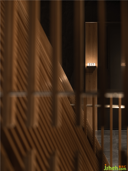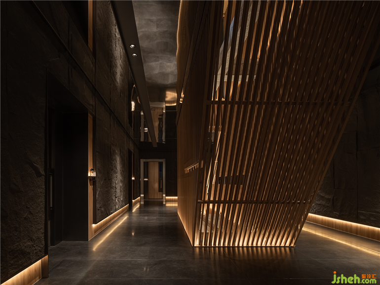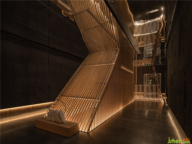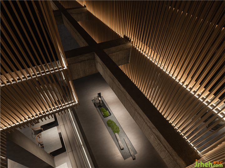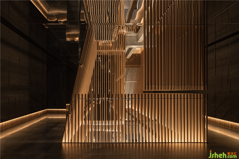 精彩的是,楼宇本身被架在层叠的「山峦」之上,将「山水」融入整个骨架,混然成势。和子SPA会馆设计密集的格栅纵贯上下,如瀑倾泻;石构横穿期间,下瞰有谷,上作千仞。峰峦在抽象隐忍的设计语言中,现其山势,隐其机锋,生出全新不同的美学享受。《溪山行旅图》仿佛被刻在基架中,成为建筑的底层逻辑。