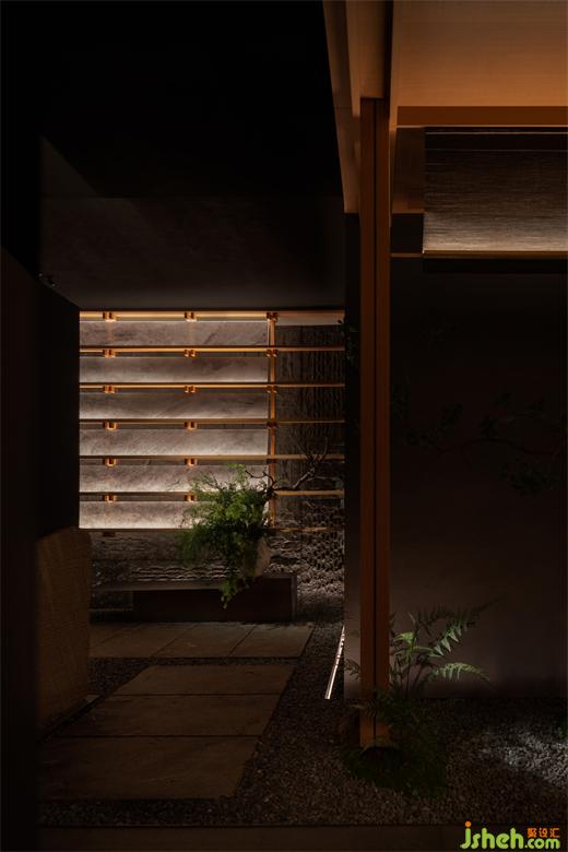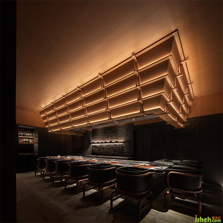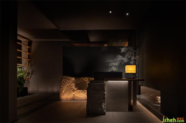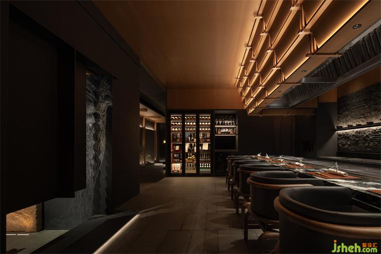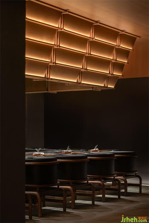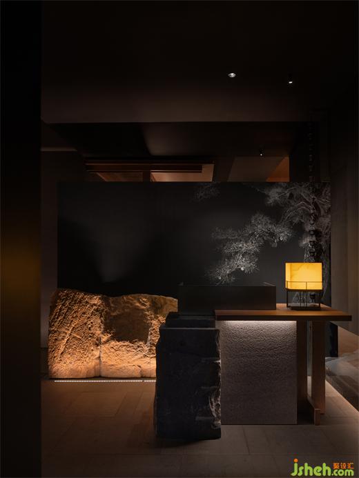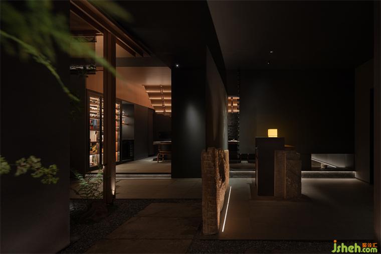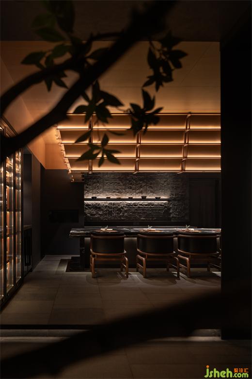 松声静夜闻,月光涵露重。空间欲扬先抑,素黑幽玄的环境中包含着对自然的敬意和缩影,雪松、岩石、明月,如在笔墨间。日料餐厅设计建筑并未寓意过多,沉寂幽玄的光影带来的克制让观者将悲喜收于内,却也牵出梦的丝线,挂于松雪之末,月隐婆娑处。