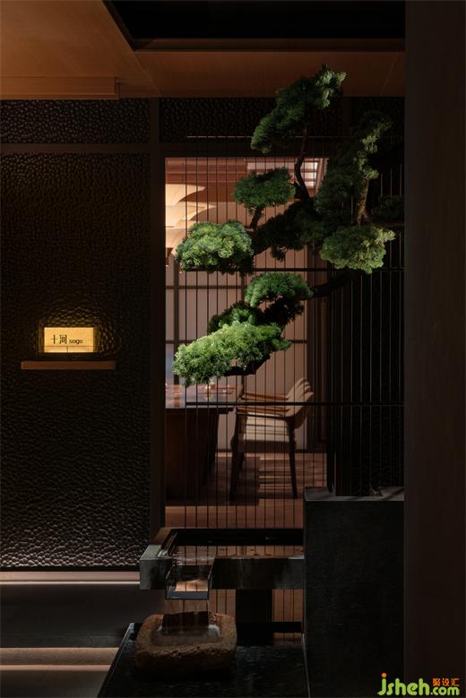 松杉敛翠阴,栏杆护新绿。庭院内的松树彼此呼应着,建筑思考着与人、与自然的关系。庭院景观中,有自然的幽玄与寂,建筑体亦是。从公共区域向包间望去,隐隐约约间,呈现画意,纵横的线条与松枝交织在一起,既透出古朴中的雅意,亦梳理出内心的宁静。