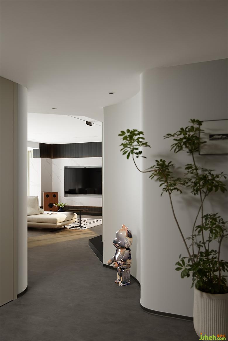 1、家装设计将进门玄关处有直角墙改为弧形墙,为空间赋予艺术性与柔和感;