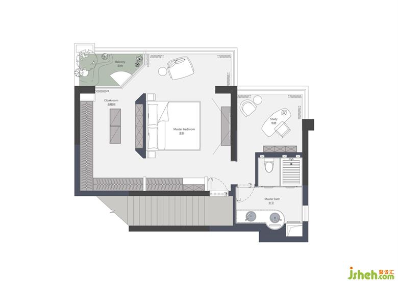 5、家装设计将主卧外的阳台隔开,一部分纳入主卧,另一部分设计成小花园,优化主卧室外景观;6、主卧卫生间重新设计,入口改为主卧套房中,保护业主的隐私;