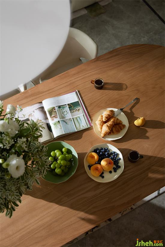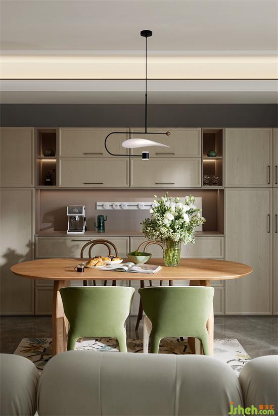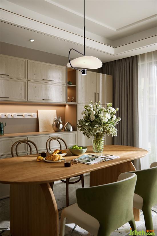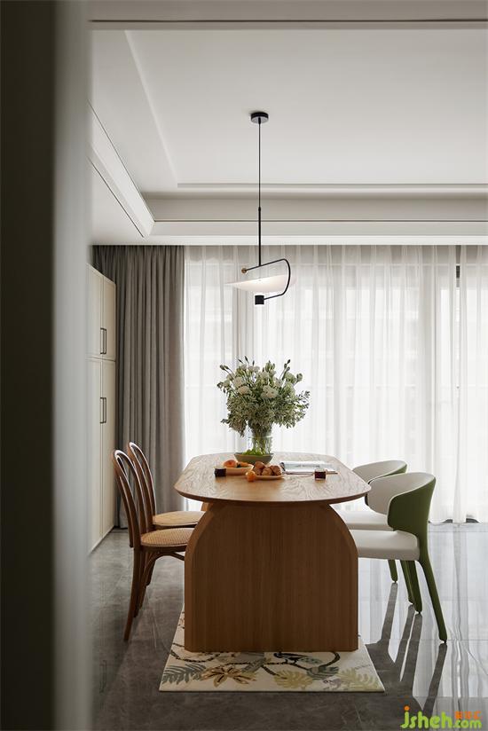 餐厅与客厅贯通,开阔通透,采光良好。家装设计餐厅延续了原木与绿色的搭配,自然清新,桌上瓶盏中的洋桔梗,更添几分生机画意。