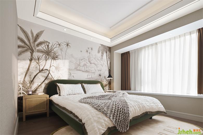 主卧墙纸选取浅调的茂密丛林,静谧又生动。家装设计让人在一天的疲惫之后,能够彻底放空自己,无忧无虑地享受私密空间,沉沉入眠。