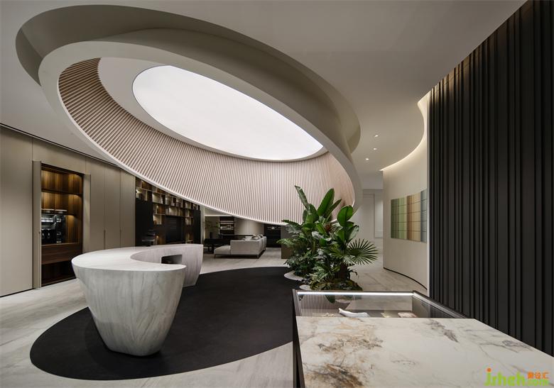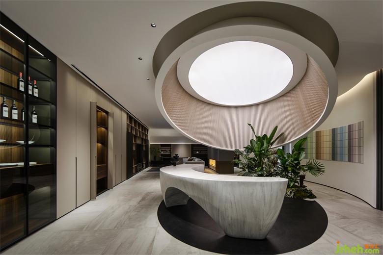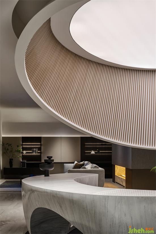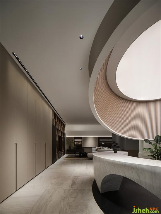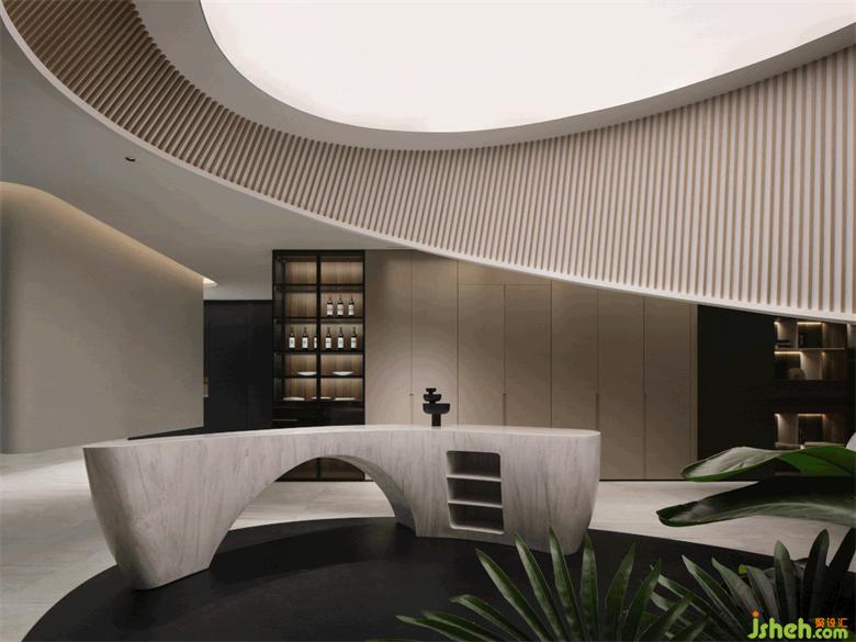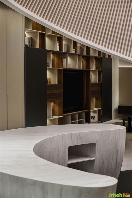 弧形的岛台,尽显曲线之美,既可以作为游览过程中的中转站暂歇,又呼应空间中的其他曲线元素,营造灵动柔和的氛围。