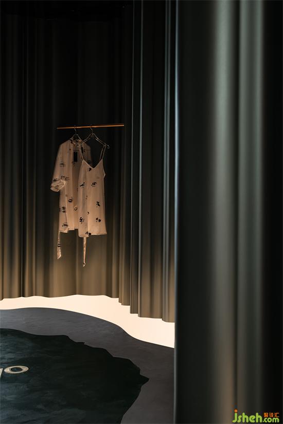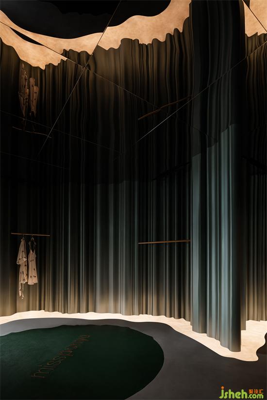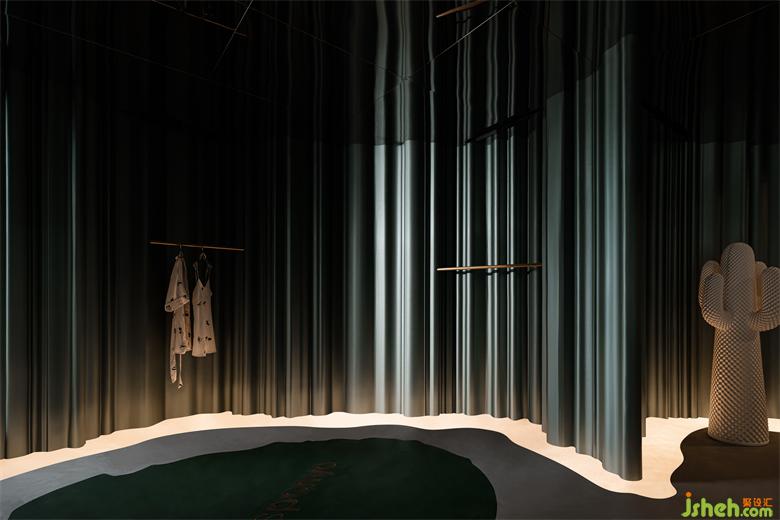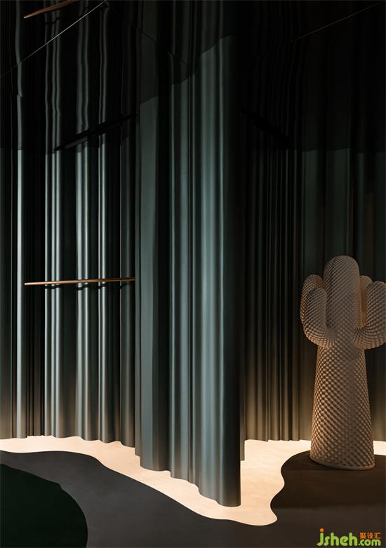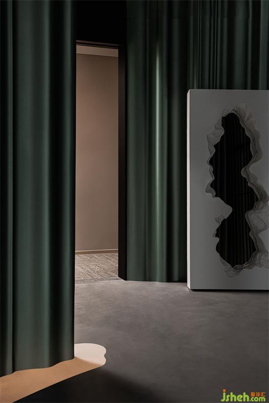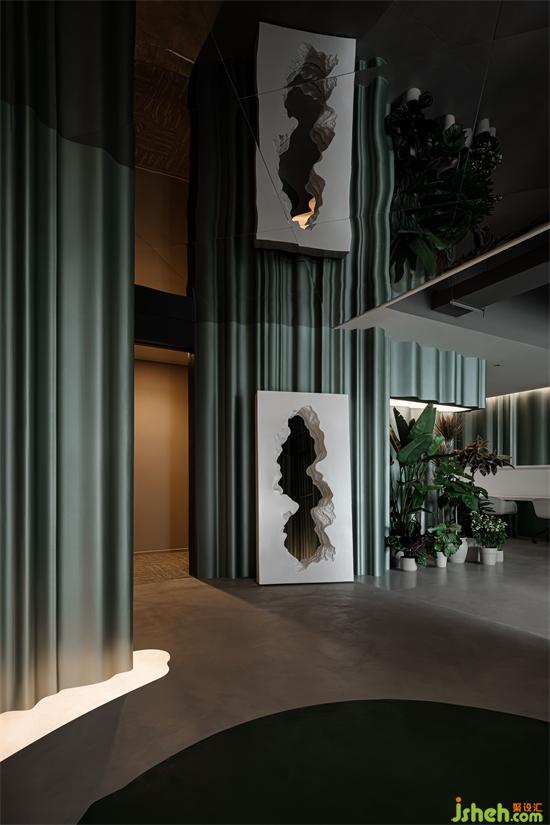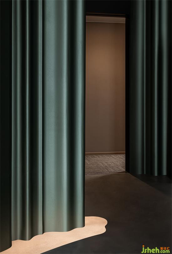 空间选用品牌的基本色墨绿色作为背景基调,如瀑布般倾泻而下的墨绿色隔墙,办公室设计以丝绸漆模仿真丝内衣质感,拉开了空间的戏剧帷幕,垂坠下绿色华美流光,在地上漾起星河涟漪,自由无拘,蔓延流转。