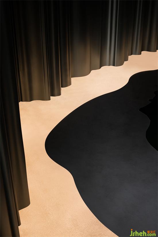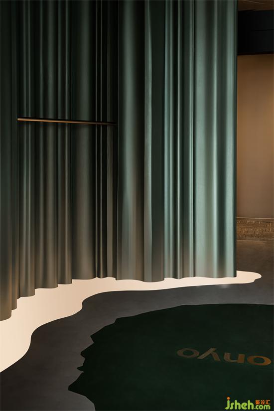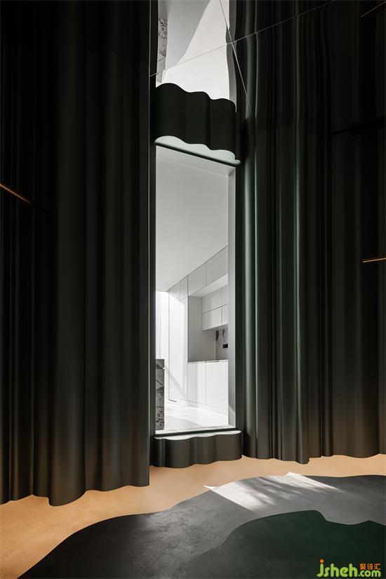 绿幕墙上的长方形门洞正是这个在暗调空间中的“神秘开口”,它沟通着沙龙区与分享区,引入自然光,办公室设计以明衬暗,强化了空间的戏剧性。