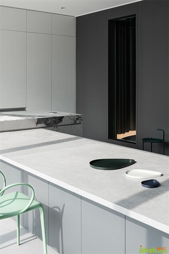绿幕墙壁上的门洞将内外空间予以串联,办公室设计通过“借景”的过渡,达到明暗空间的划界与碰撞,自然之光与表现之光也在此产生张力十足的对话。