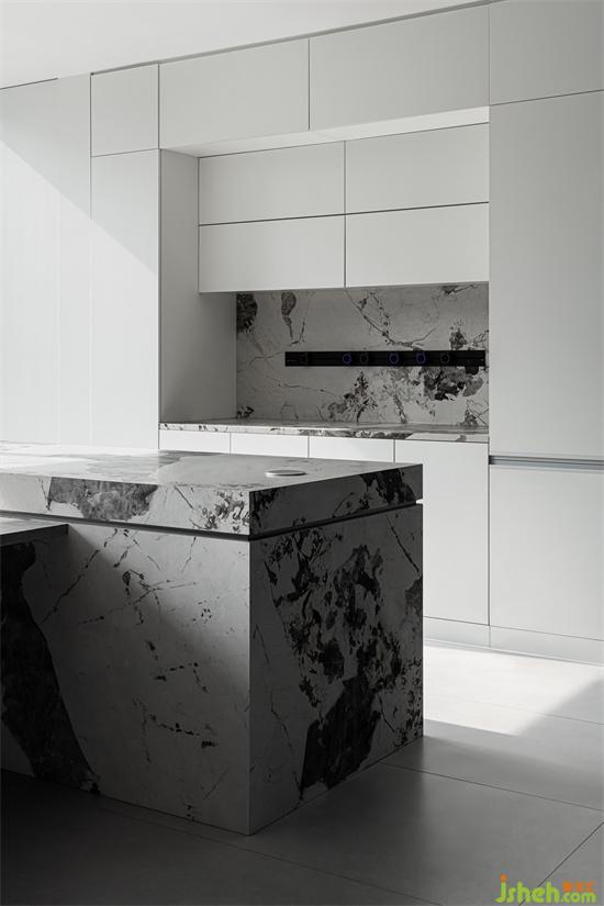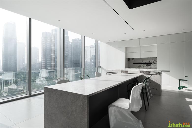 在明媚的自然光下,经典黑白灰色调的运用,更为简净明快。长桌岛台可容纳多人进行会议交流。办公室设计沙龙区水吧、冰箱、微波炉、电视墙等设施一应俱全,营造出休闲感十足的生活氛围。