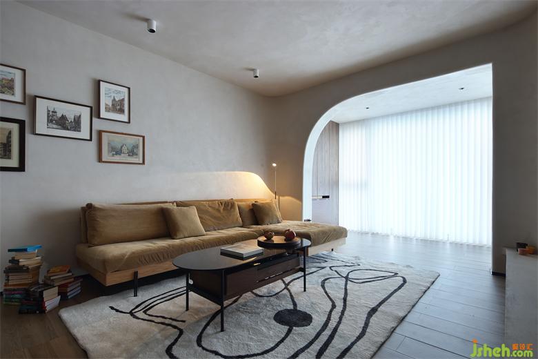 低饱和度的浅棕色沙发,渲染温润的色调,饰有简约线条的白色地毯透露出些许艺术气息。家装设计昏黄柔暖的灯光晕染开家的美好日常。