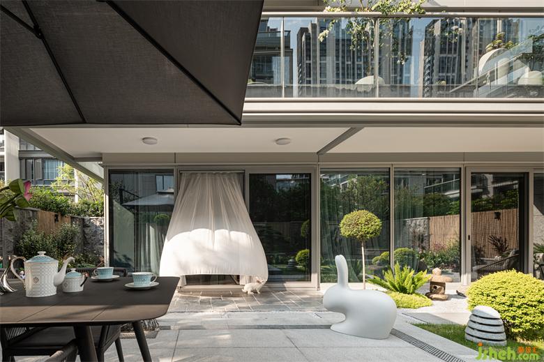 园中枝繁叶茂,明媚的阳光尽情倾洒在院内,当白色窗帘随风飞舞的瞬间,业主家养的活泼好动的小白兔也在蹦跳间入镜,与俏皮的Qeeboo白兔椅完美呼应,正是镜头定格的神来一笔。