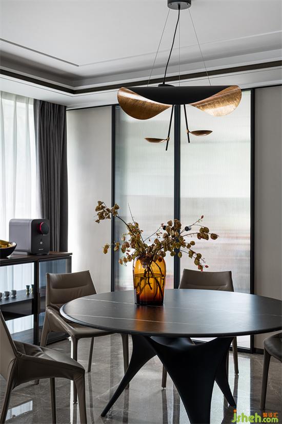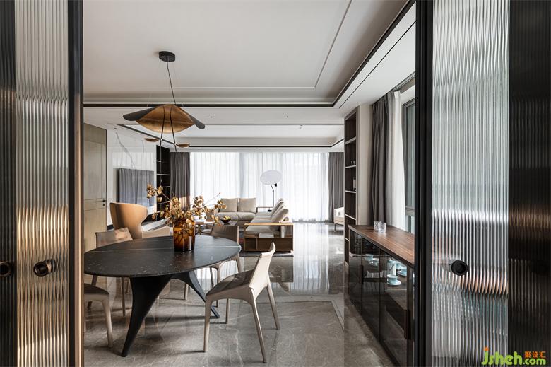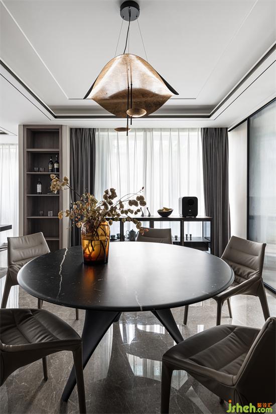 客餐厅贯通一体,视野开阔。别墅设计餐桌采用特殊磨砂处理的MC大理石台面,质感温润,避免了光面带给人的冰冷感。