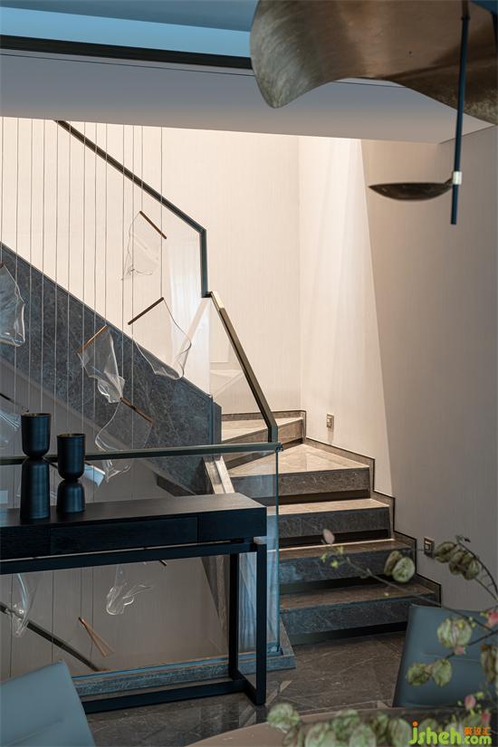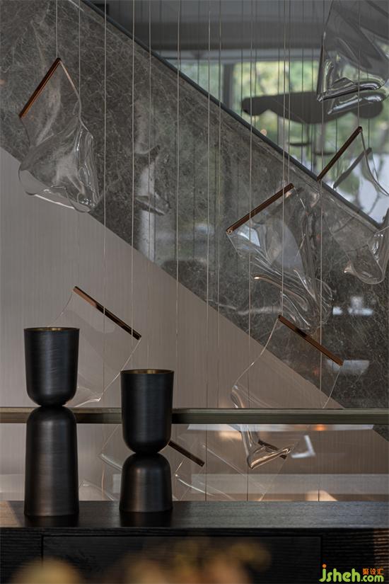 理性的折线楼梯搭配垂坠的透明吊灯,和谐之余,别墅设计也将空间勾勒得更富肌理感。