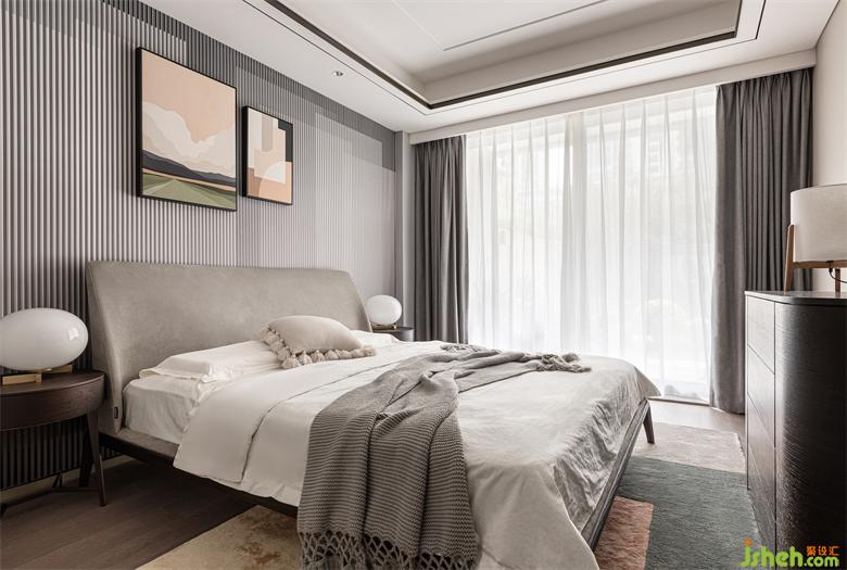 次卧色调静谧柔和,装饰艺术版画,使空间变得更加生动多姿,别墅设计营造出一种适于休憩的沉静氛围。