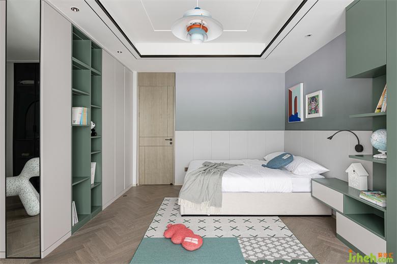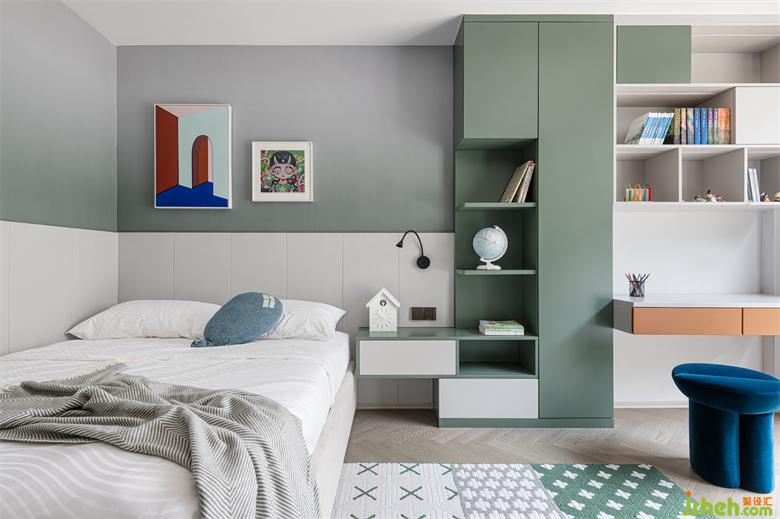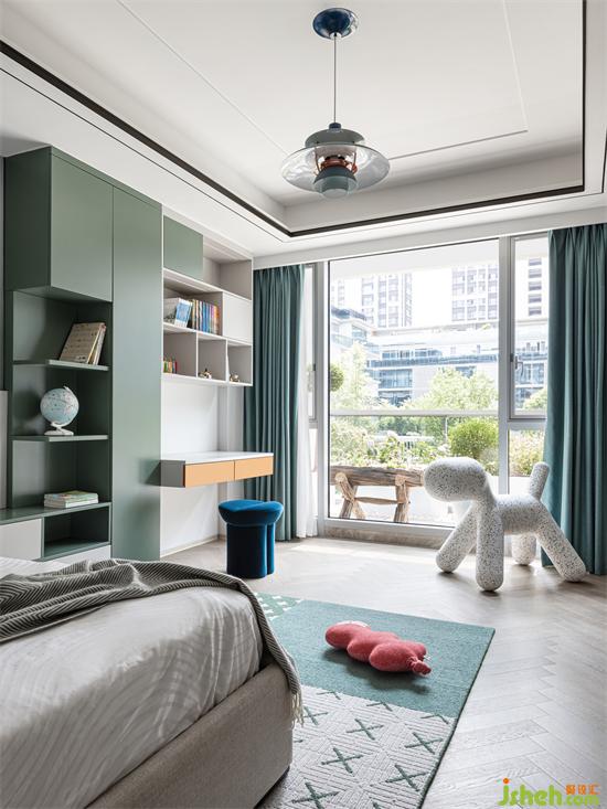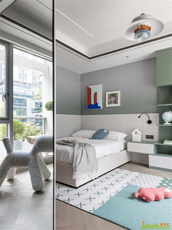 儿子房以柔和的绿色调为主,清新自然,充满生机与活力。别墅设计空间中充足的柜体收纳,满足孩子成长过程中的各类收纳需求。