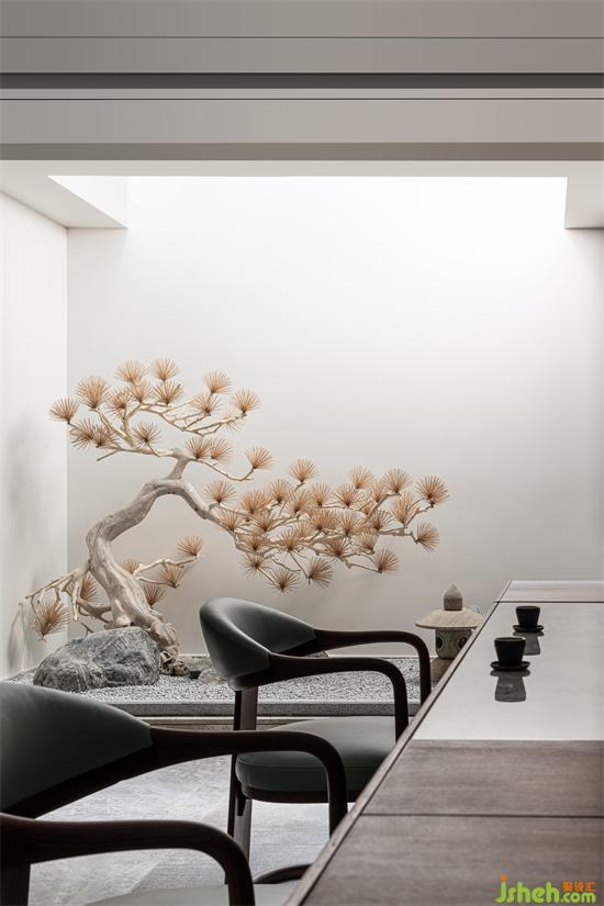 典雅的茶室线条干净利落,别具韵味。枯山水的意境营造,禅意十足,同时又与空间的自然主题一脉相承。