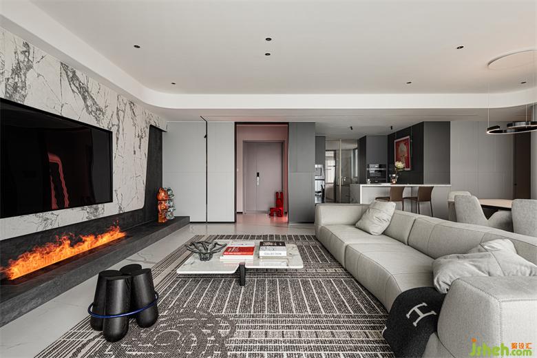 客厅视野开阔,采光极佳,透过落地窗,即可将成都国际城南的繁华景观尽收眼底。空间以经典的黑白灰色调作为主色调,利用版画鲜艳的红色作为跳色,沉稳质感之中,又不乏热情活力。