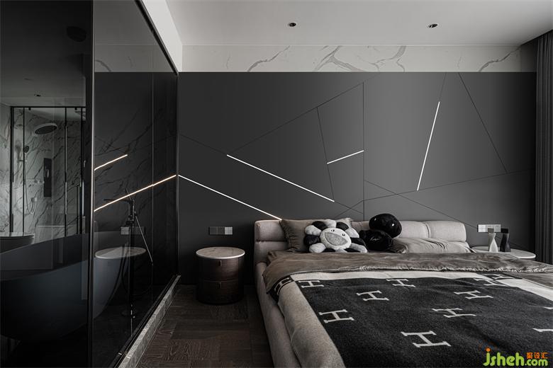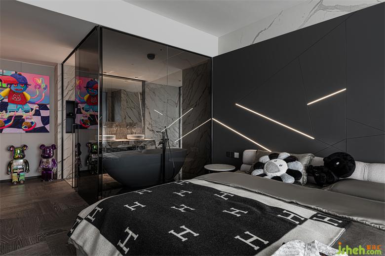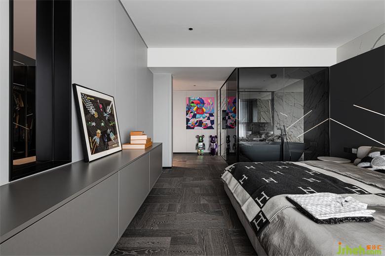 设计师在对原有空间进行合理改造之后,得到了一个完整的主卧套房。家装设计主卧以黑灰色为主色调,突显酷黑典雅的格调,沉稳静谧,利于睡眠。装饰别具个性的潮玩手办与版画,俏皮活泼,趣味性十足。