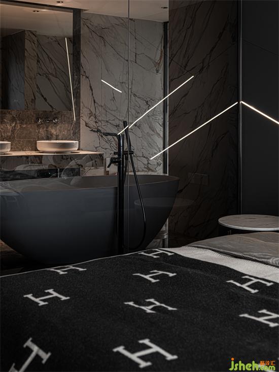 墙壁上延续着空间的斜线元素,延展出斜线的方向与动感,为静谧空间融入巧妙的动势引导。
