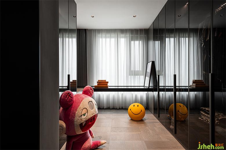 衣帽间收纳有序,可爱的卡通玩偶,彰显着居住者大男孩般的游戏之心,笑对生活,乐观洒脱。