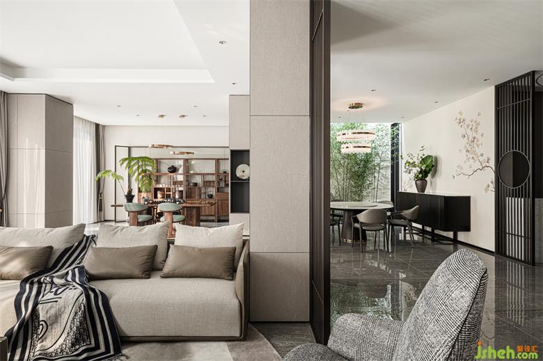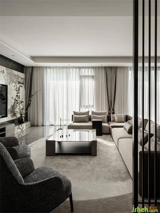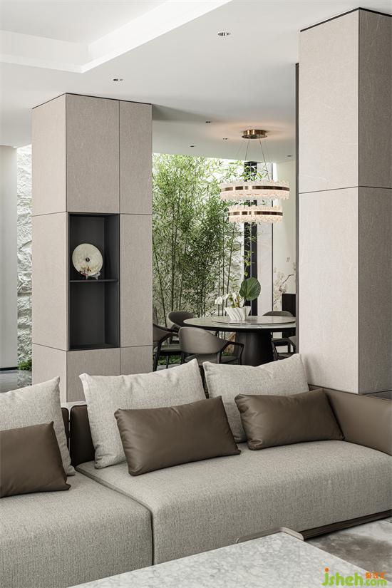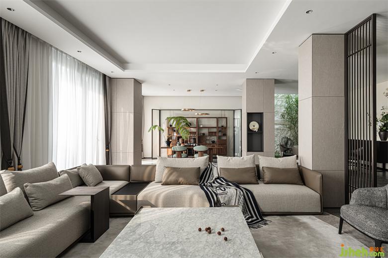 奶油灰的主色调,氤氲出空间温软宁谧的氛围。别墅设计舒适素雅的拐角沙发,坐感极佳,是闲时最佳的放松之地。