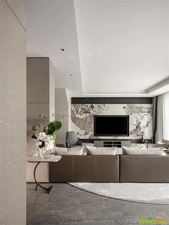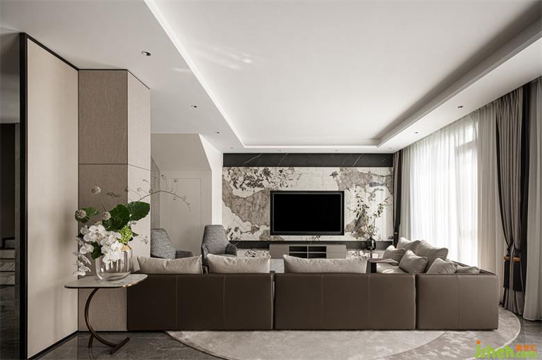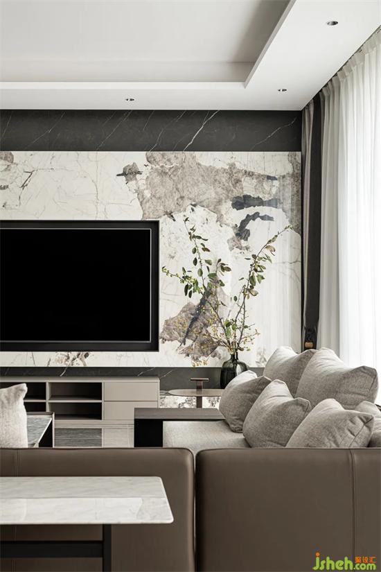 电视背景墙的纹路如泼墨画般自然流动,丰雅有致,颇具情趣。