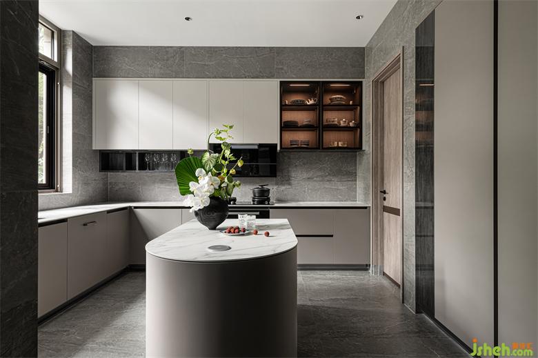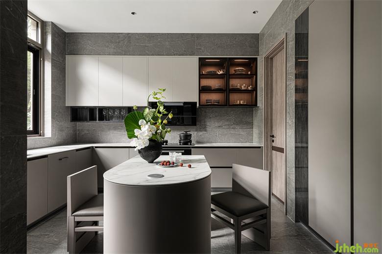 夫妇二人对厨房有着自己的理解,根据自身多年的生活习惯和生活经验,他们很少到外面吃饭,并不喜欢偏于形式化的西厨,而钟爱于大气开阔、实用性更强的中厨。为了满足夫妇对厨房的高要求,设计师将原有的狭小空间予以拓宽,做了大气宽敞的中厨。别墅设计大玻璃窗设计,让厨房拥有着良好的通风与采光。中间的岛台平时可以作为一张小餐桌,满足四人日常的家庭用餐。