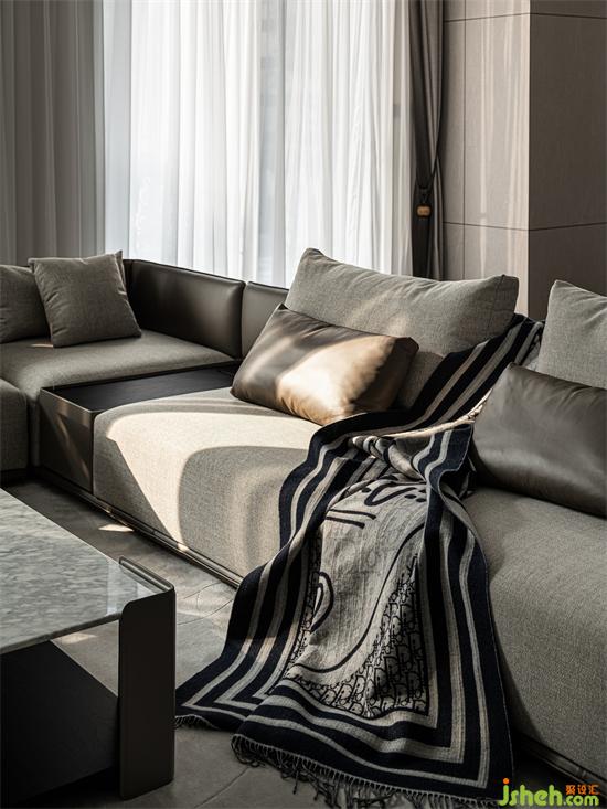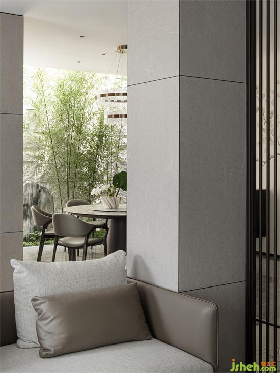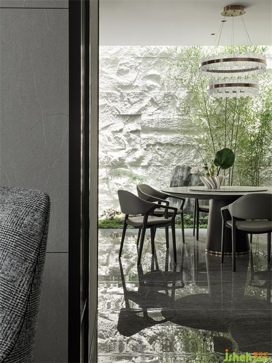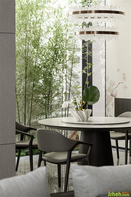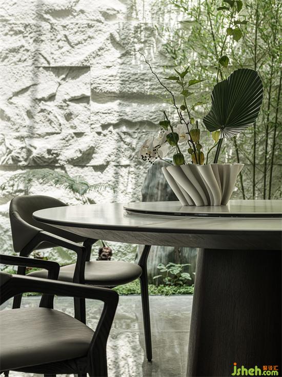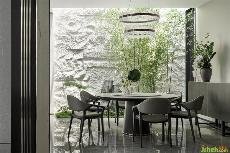 客餐厅通透的动线让家人间的沟通交流更加方便,塑造着彼此间更为深刻的情感链接。别墅设计绿意装饰的餐厅,在家中的很多角度进行观看都能达到一种园林造景的意趣。