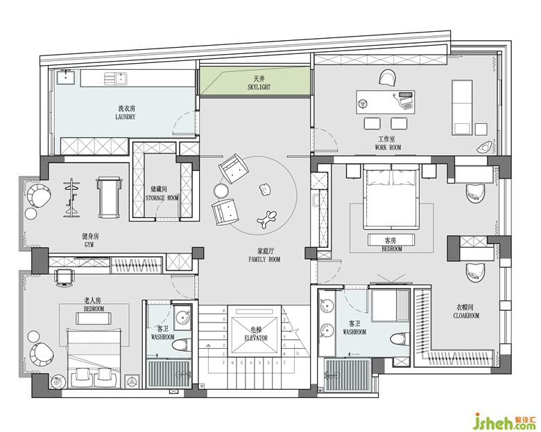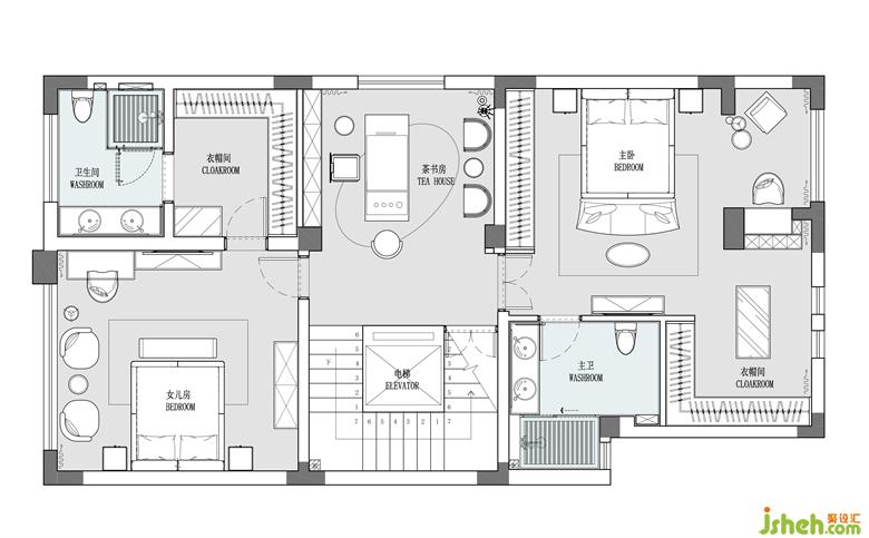 三楼设计了两个套房:主卧套房和女儿套房。中间有一个茶书房,供闲时阅读品茗,同时满足夫妇二人的交流需求。