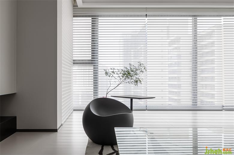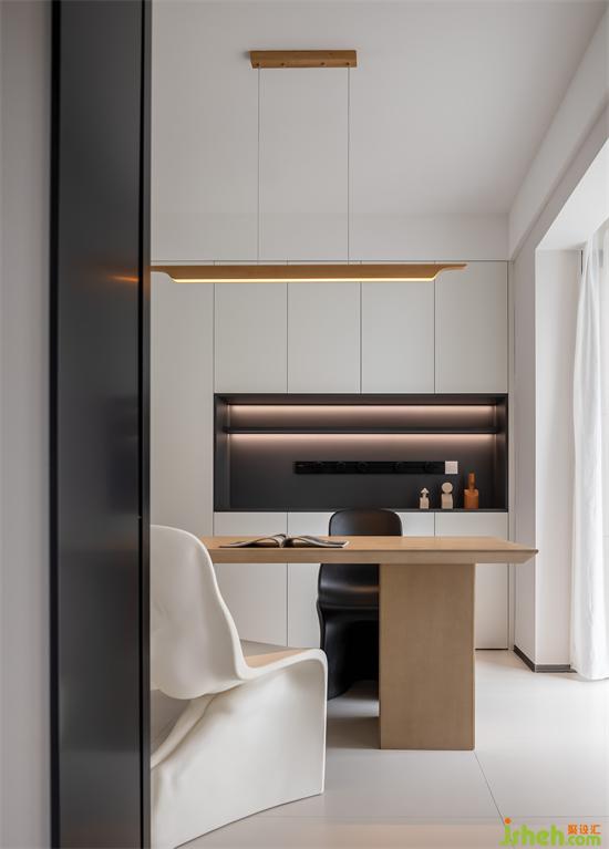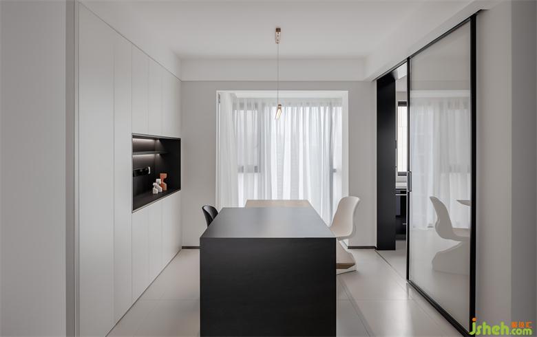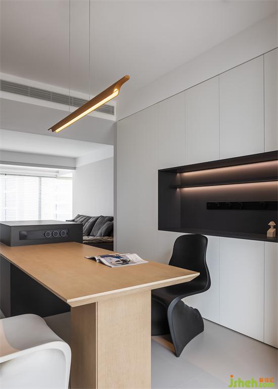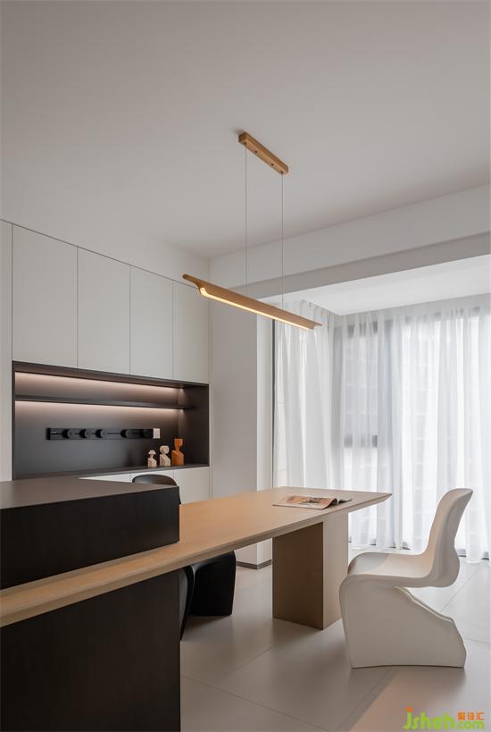除了经典的黑白色调以外,餐厅引入木色调,烘托自然温润之感。同时,餐桌独特考究的嵌入式造型,简洁之余,别具质感。