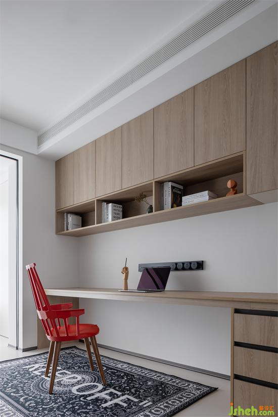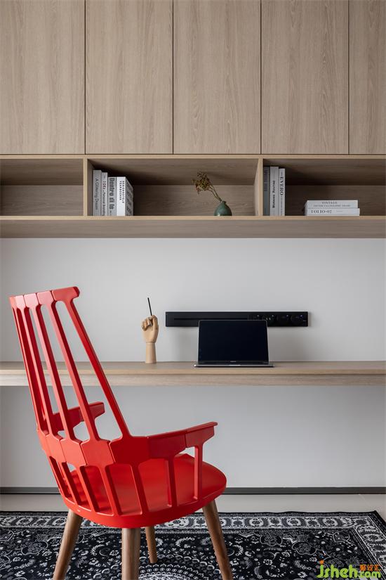 书房设置吊柜进行收纳,简单整洁。沉静的木色营造出安静的工作学习氛围。家装设计红色的座椅,充满让人醒目的热情,使整个空间活力十足。