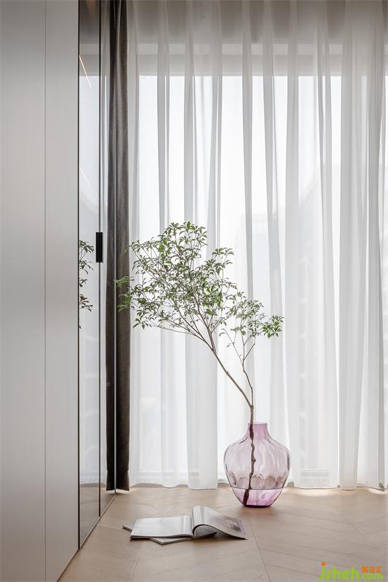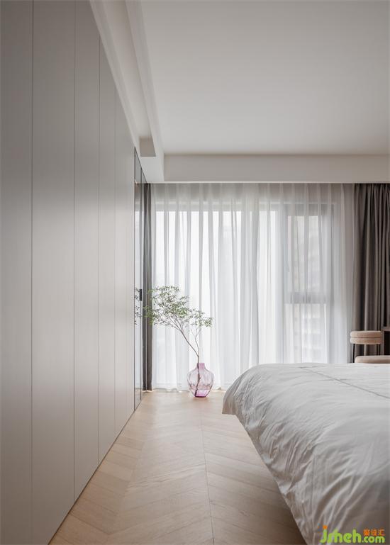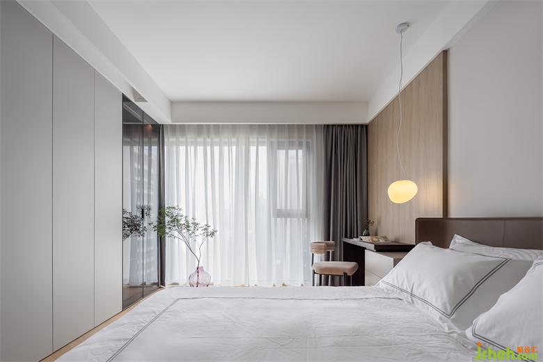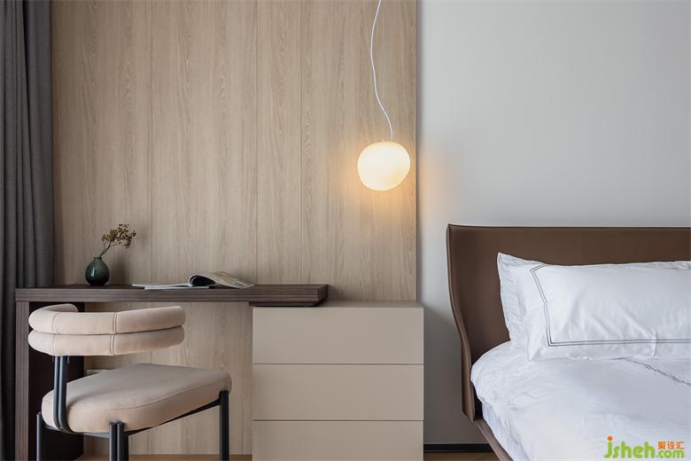 主卧运用大面积的奶油灰色调,柔雅温馨。家装设计良好的通风与采光,营造出舒适的睡眠环境。